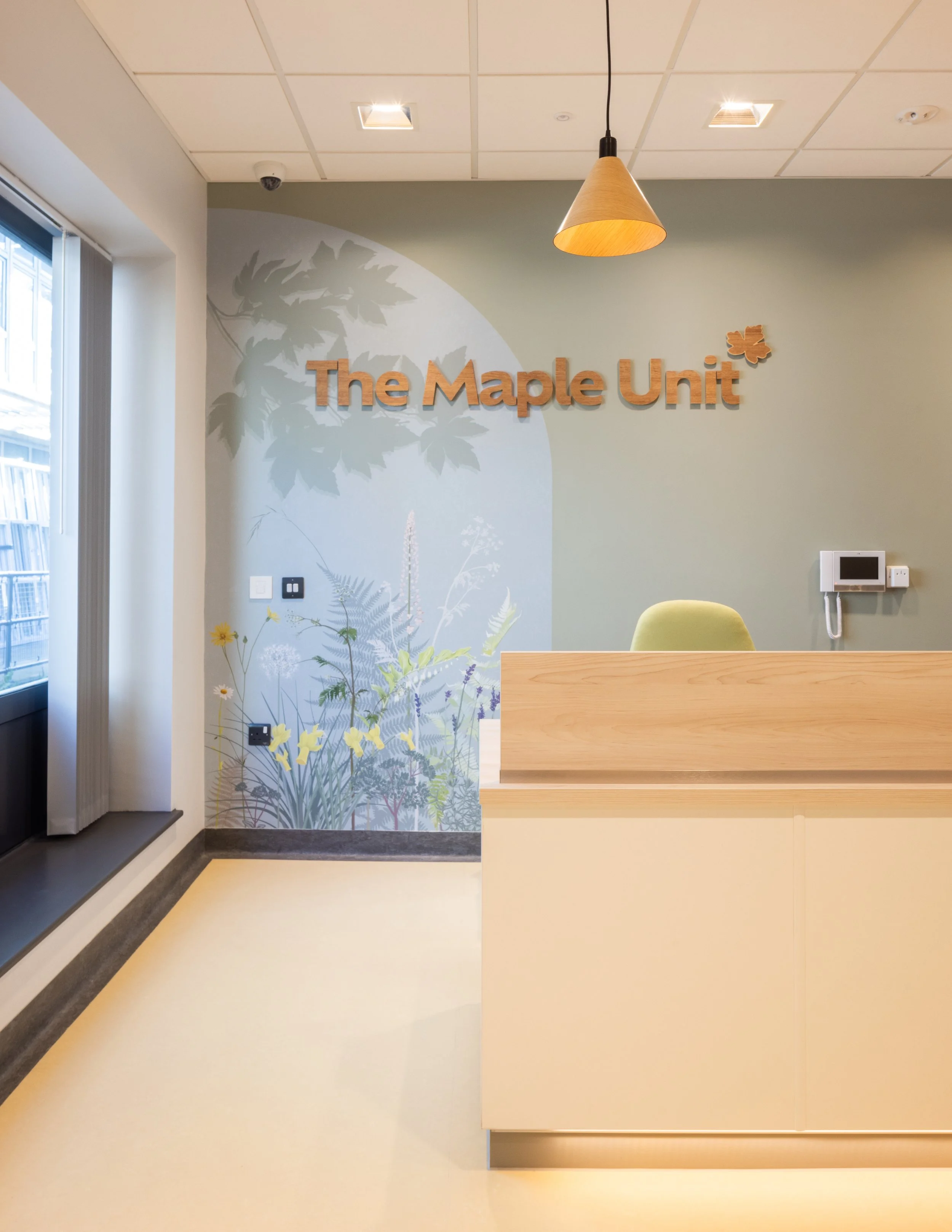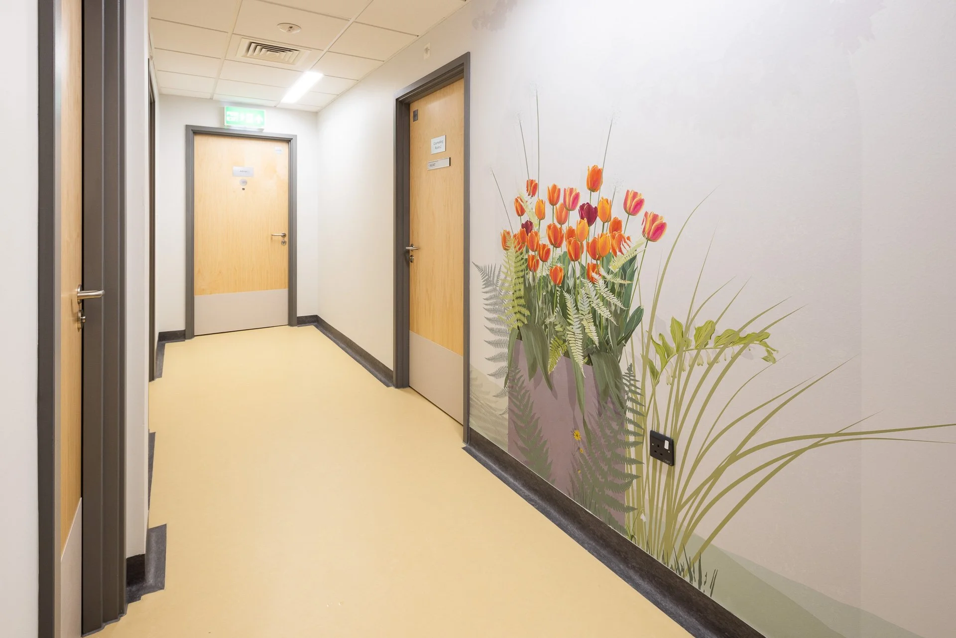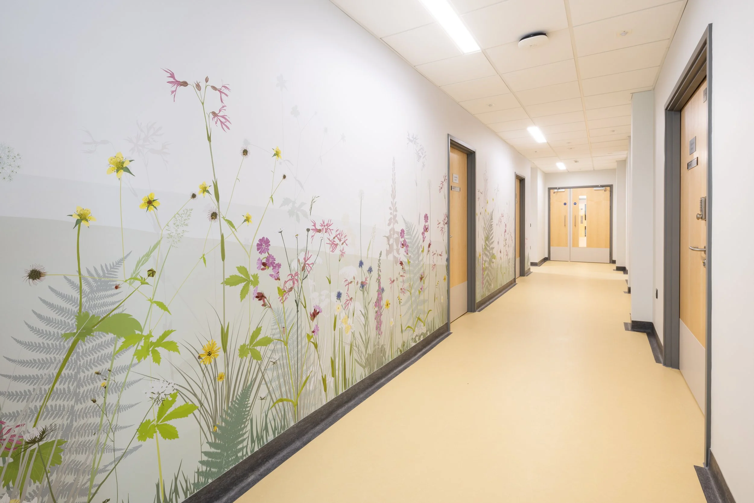Kate worked with Surrey and Borders NHS Trust and Arcadis to develop 17 nature inspired murals for Silverwood. They span from the entrace corridor, all the way through the main circulation jouney and into 4 ward lounges. This body of work was created as a result of a thorough engagement process that included practical workshops and formal feedback.