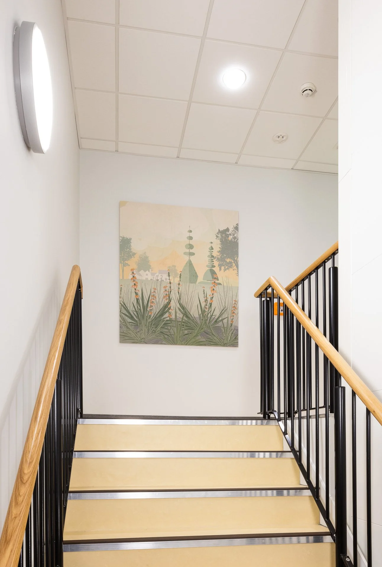 The artwork sits beautifully next to the wayfinding and reflects the colour palette. Care was taken to make sure the artwork looked ‘part of the wall’, rather than than placing rectangular blocks onto the wall.